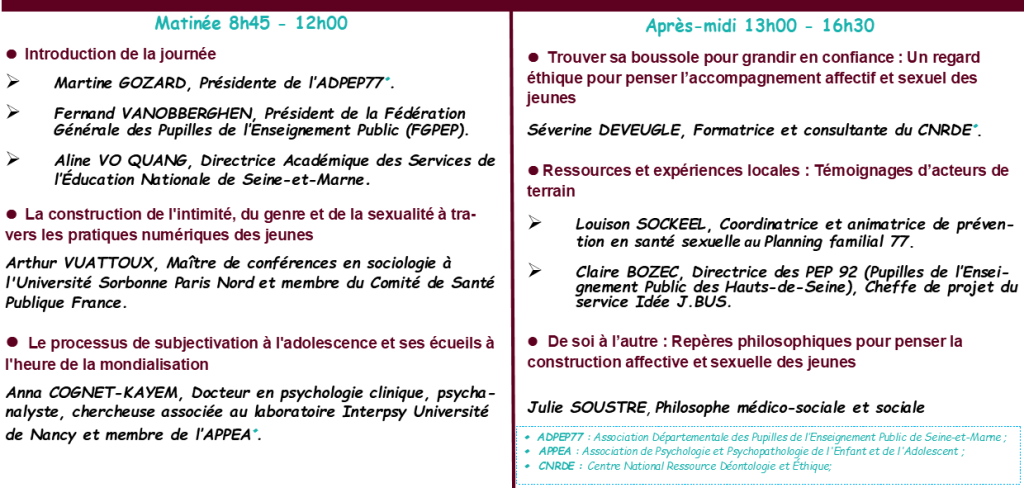 Les inscriptions pour notre 13ème journée de formation et de réflexion intitulée  “À la croisée des courants : Comprendre les influences sur la vie affective et sexuelle des jeunes” sont désormais ouvertes !